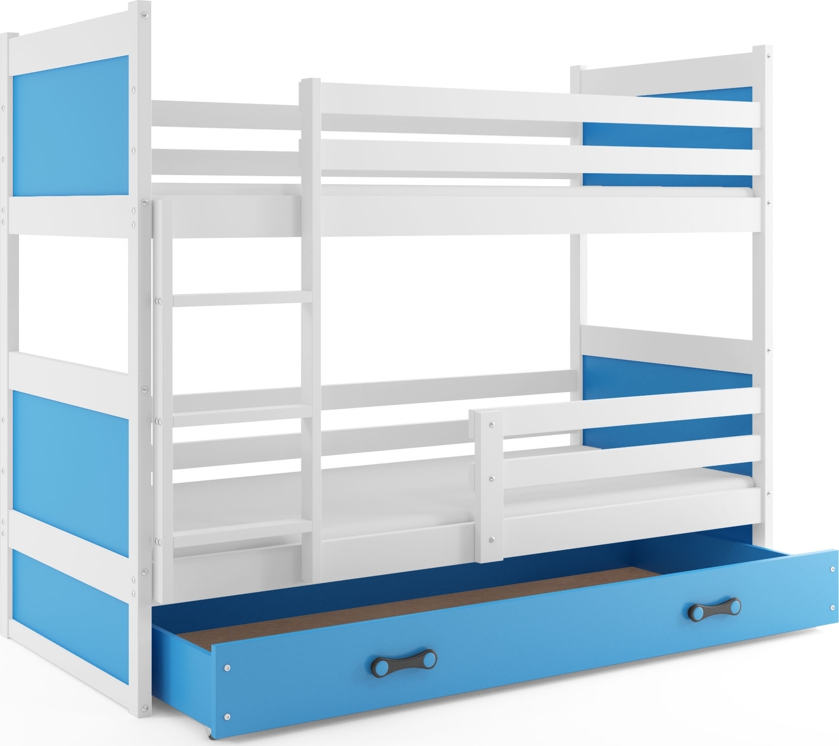 Våningssäng med utdragbar förvaringslåda på hjul. Sängen är byggd på en stomme i massiv furu med ribbor av björkträ som vilar på metallskenor. Sidor och panel är av MDF. Sängen är lackad/målad med vattenbaserad allergivänlig lack/färg. Placering av säkerhetsbarriärer och stege är valfri och görs av kund vid montering. Madrasserna av 7 cm:s polyuretanskum har ett överdrag av hypoallergent polyestertyg. Överdraget är försett med blixtlås och kan tas av för tvättning. Sängen är tillverkad efter TÜV:s kvalitets- och säkerhetsstandard. Sängen levereras omonterad.