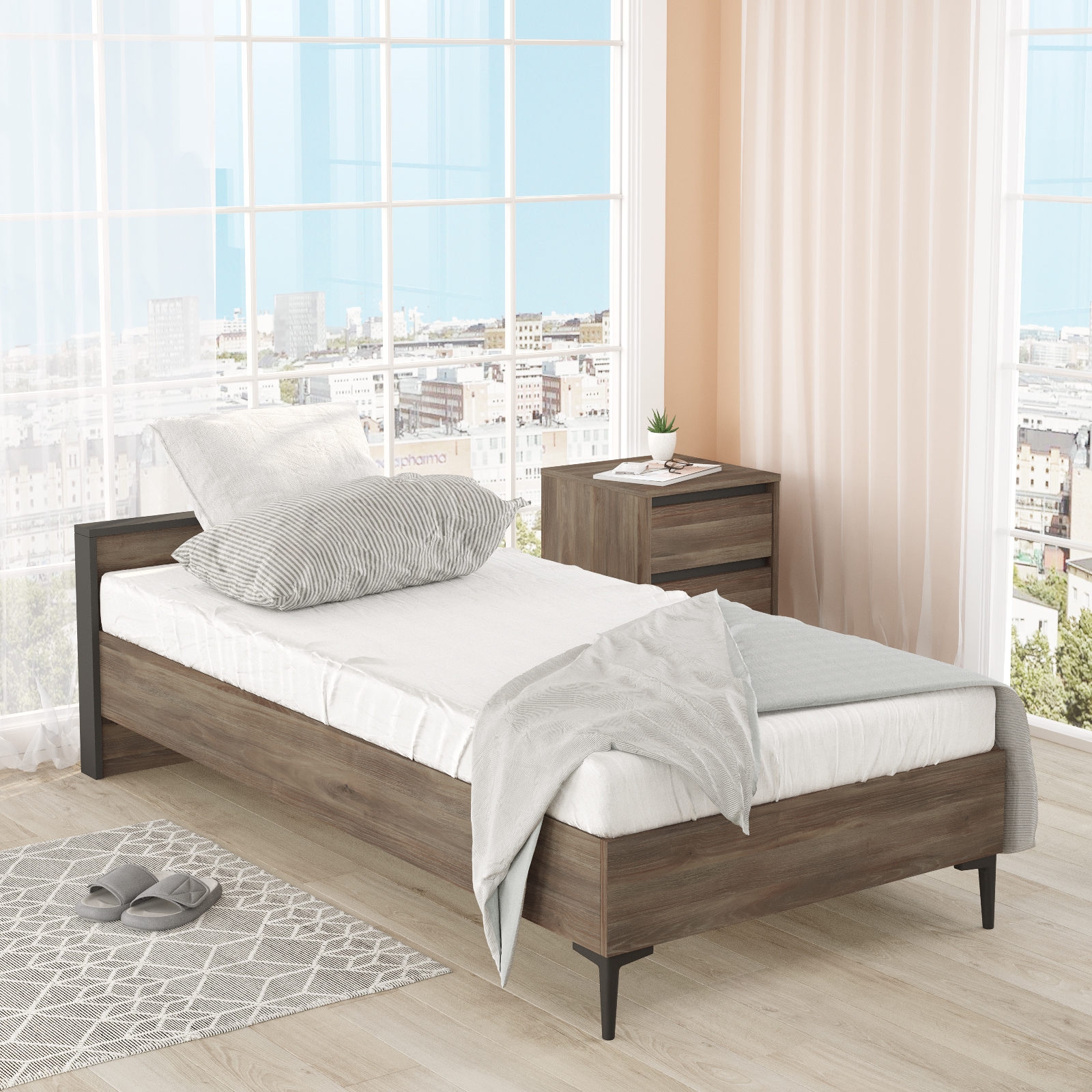 Sängram av melaminbelagd spånskiva. Ben av plast. Madrass ingår ej.