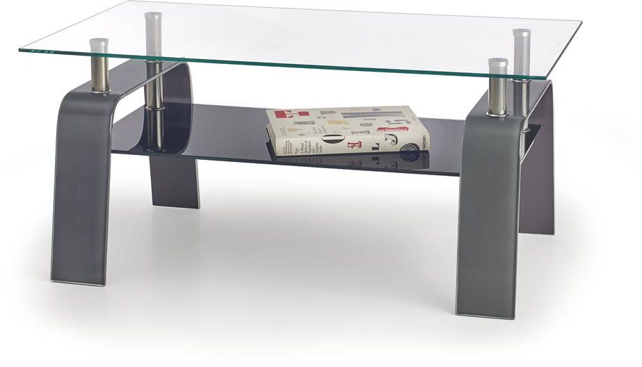 Ett häftigt soffbord med en härlig modern design. Underredet är tillverkat i matt grått glas med detaljer i kromad metall. Bordsskivan är av klarglas med en praktisk underhylla i svart glas för smart förvaring.
