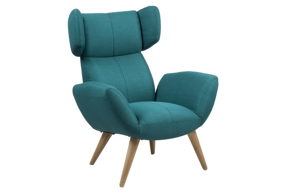 Mjuk och bekväm fåtölj, klädd i petrolium blått tyg och ben av oljebehandlad ask.