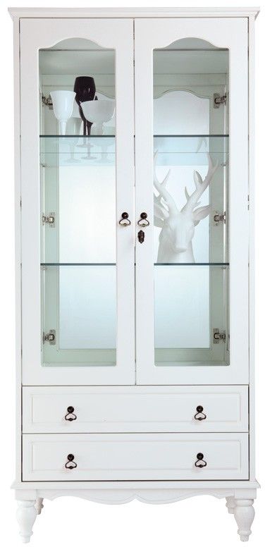 Ett snyggt vitrinskåp med en klassisk design med många arbetade detaljer på benen och i träet. 2 stora lådor för praktisk förvaring och ett skåp med glasdörrar och två glashyllor för förvaring av prydnadssaker. Passar perfekt in i hushållet.