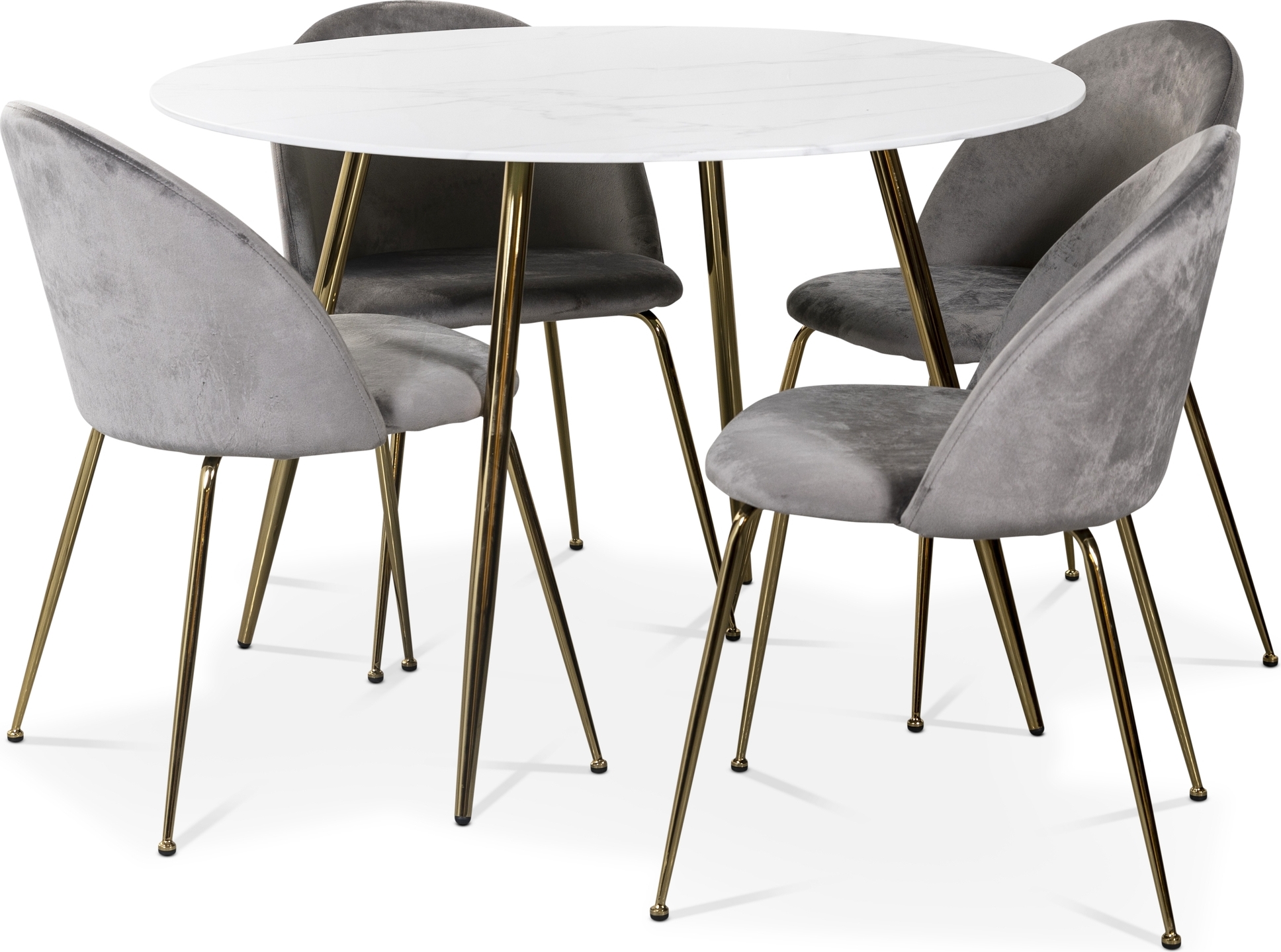 Art matgrupp: Runt bord marmor/Mässing + 4 st Art stolar grå sammet / mässing