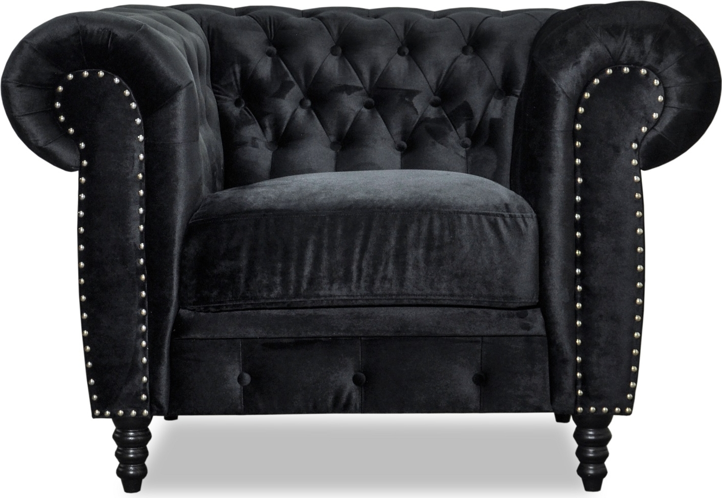 Ashford chesterfield fåtölj i ett svart sammetstyg, med härlig komfort och god kvalite. Pocketspringfjädrar i sits för både lång hållbarhet och en fantastisk sittkomfort. Chesterfield är en klassiker som passar både i det moderna eller klassiska vardagsrummet. Svarta svarvade ben.