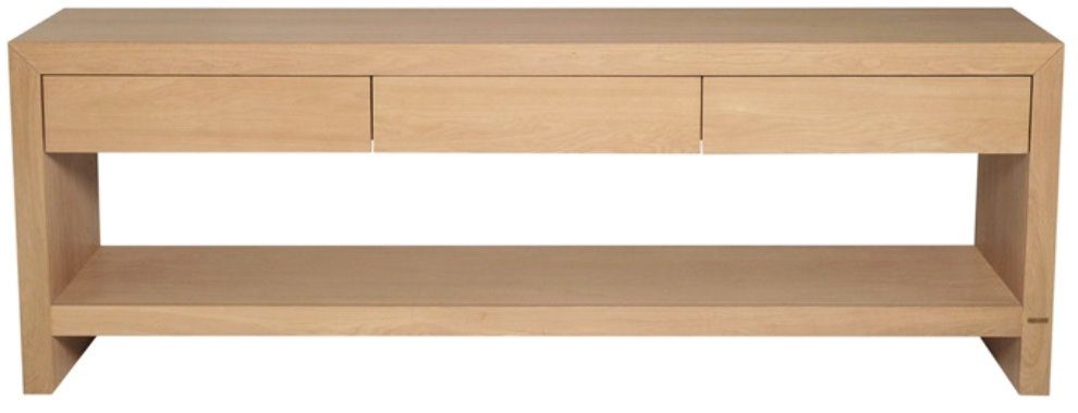 Stilrent konsolbord i vitpigmenterad ekfanèr med 3 lådor och ett hyllplan. Levereras monterat så kan börja användas direkt.