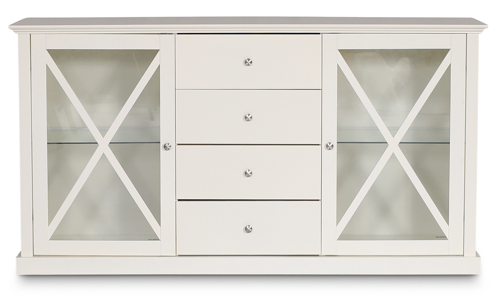 Astrid är en klassisk skänk av lackat trä i cremevit nyans. Vitrindörrar med klasiska kryss och justerbara hyllplan.