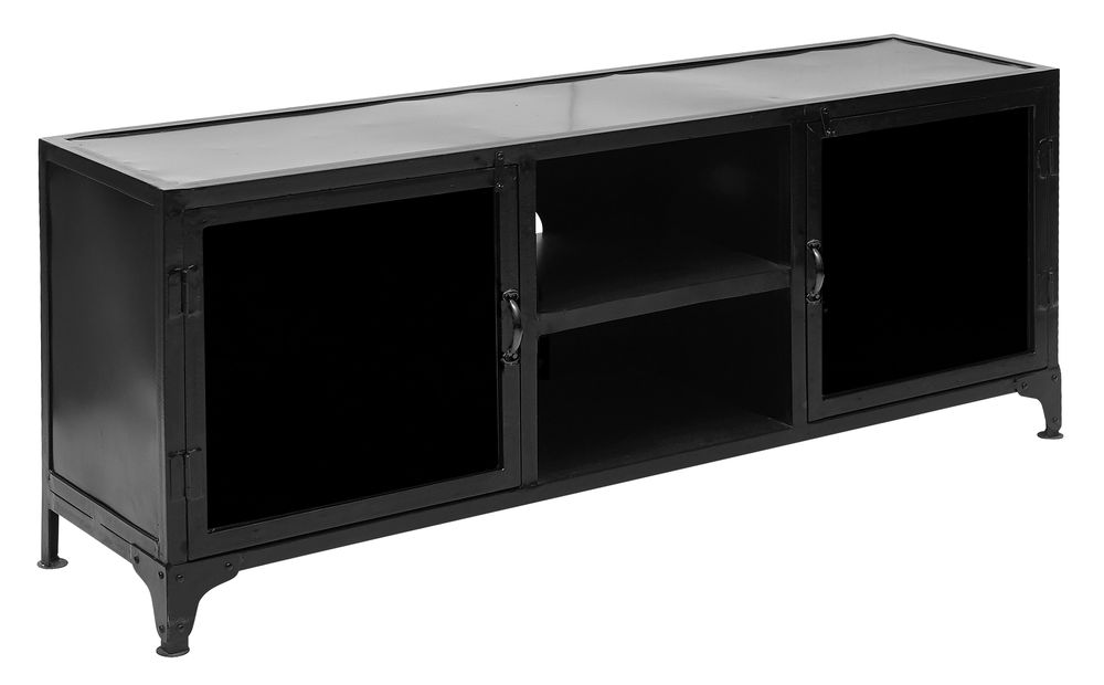 Mediabänk i svartlackad metall med hyllor och luckor för förvaring. En möbel som inger en rustik känsla med tanke på materialval. Tålig och robust.