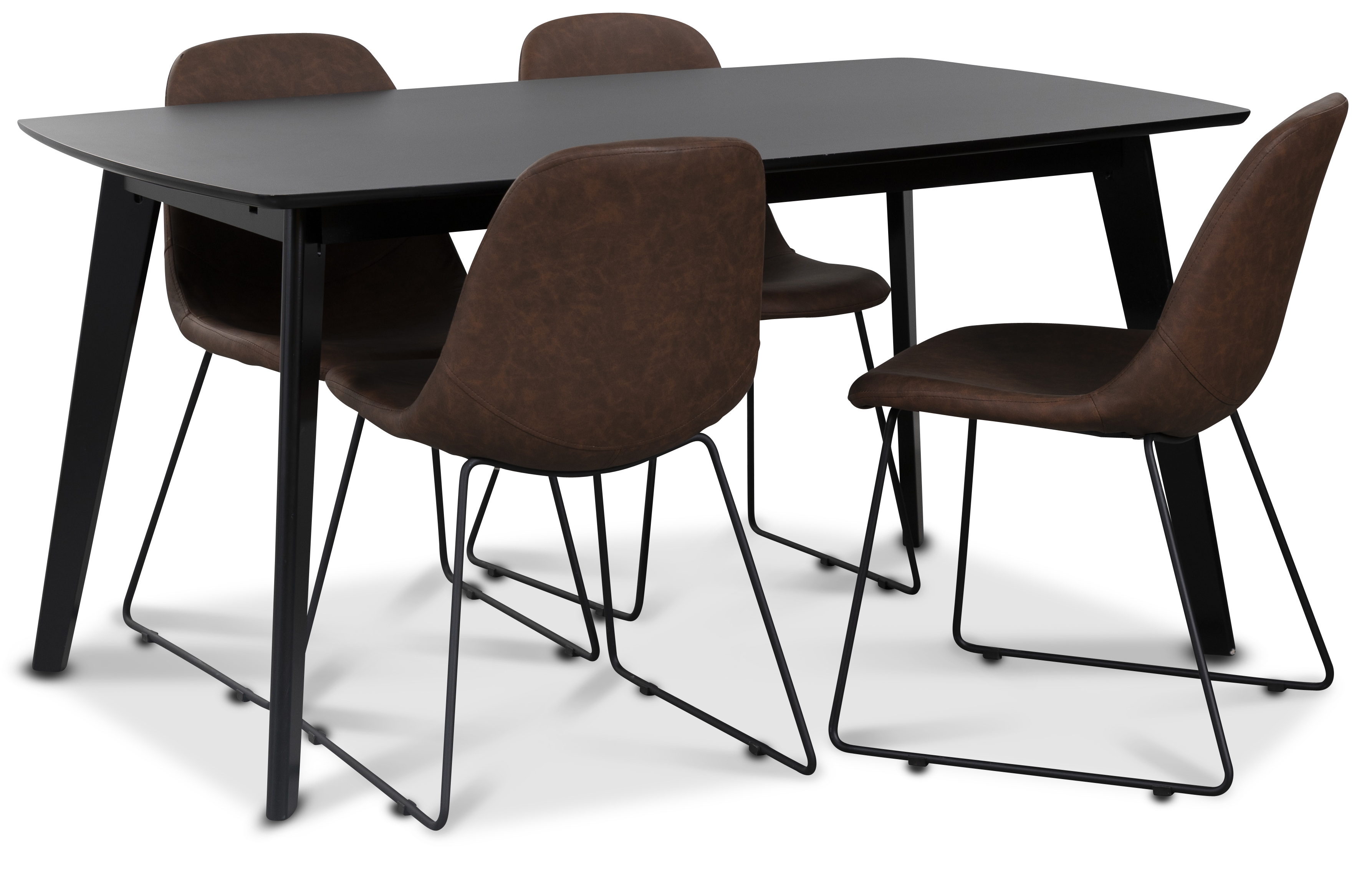Matgrupp från Skånska Möbelhuset, Oliver matbord med högtryckslaminat. Fyra stycken Atlantic Sled matstolar i brun tålig PU med svarta ben.