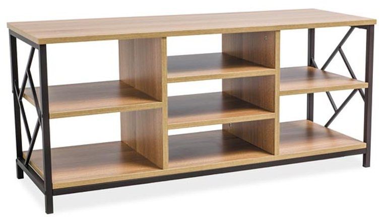En snygg TV-bänk med en modern design. Underredet är tillverkat av mörkbrun metall och bordsskivan är av MDF med ek utförande. Rustad med ett flertal hyllor för smart förvaring av elektronik m.m.