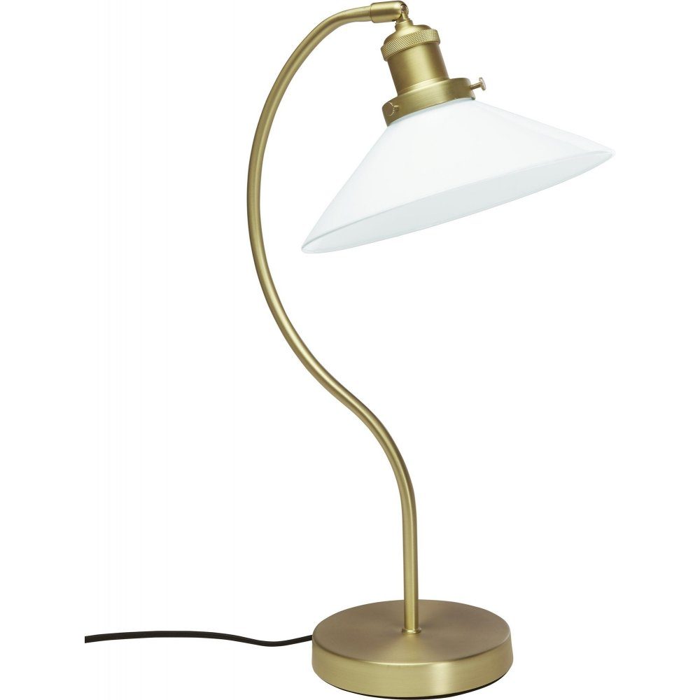 Axel Bordslampa i metall och lampskärm i glas. Klassisk rundad båge i metall med finish i mässing och justerbar lamphållare. Den opalfärgade glasskärmen ger ett fantastiskt sken och skapar ett vackert blickfång. Glasskärmen monteras på metallbågen med tre stycken skruvar som i sig utgör en vacker detalj och förhöjer den klassiska känslan.