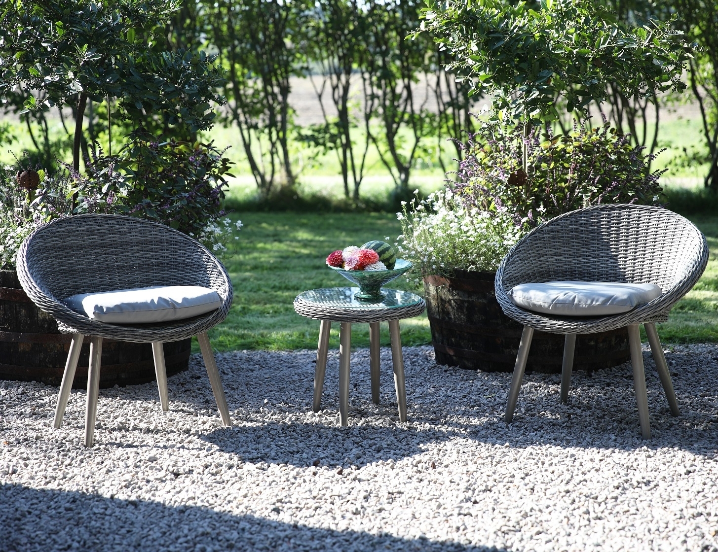 Härlig liten loungegrupp som inte tar för mycket plats. Gruppen är väldigt rund i formen och ger en mjuk känsla. Därför gör den sig bra på de flesta ytor, balkonger och altaner. Paketet innehåller två stolar med dynor och ett bord lagom för frukost eller kaffe.