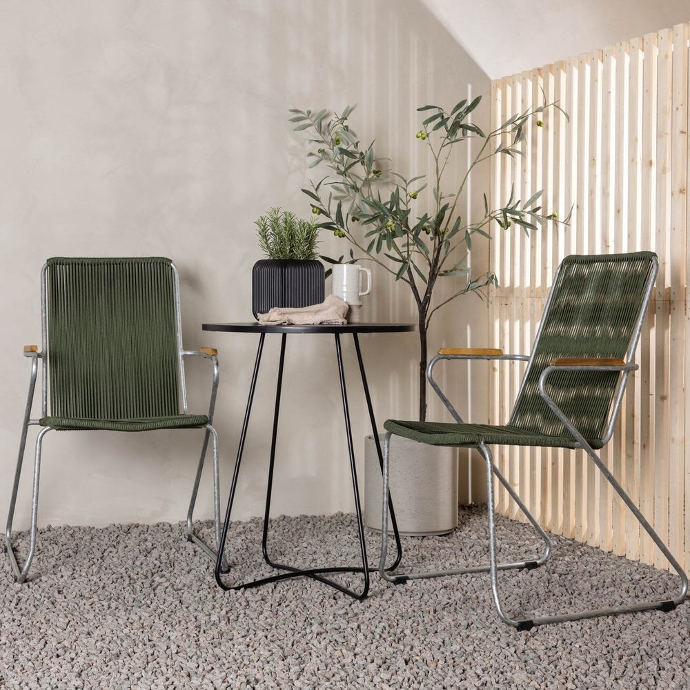 Skapa ett modernt och charmigt blickfång på den lilla balkongen eller uteplatsen! Matstolarna från serien Bois har ett smäckert utförande i trendsäker design. Tillverkade i stilren zinkkonstruktion, sits i smäckert grönt rep och dekorativa armstöd i teak. Här i snygg kombination med ett nätt cafébord från serien Bacong. Bordet har en nätt, rund toppskiva och smala ben i svart stål. Duka ut fikan i sommar och njut av trivsamma stunder.