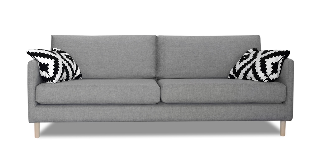 En modern 3-sits soffa med skummstoppning och ram i björk och furu med raka ben.