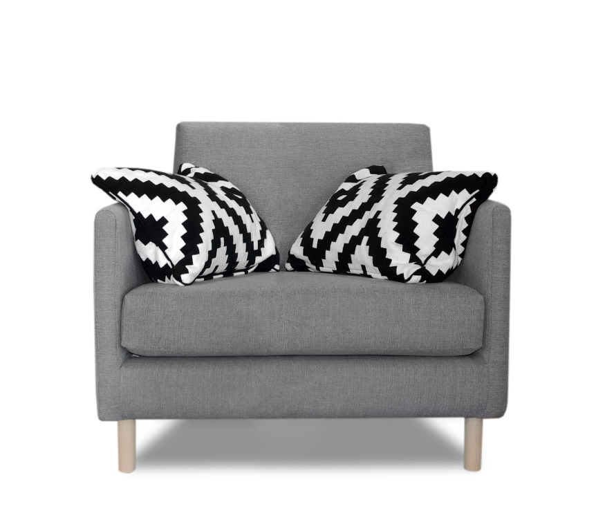 En modern fåtölj med skummstoppning och ram i björk och furu med raka ben.