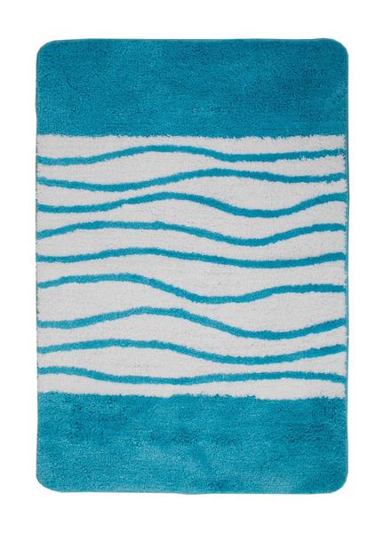 Taranto badrumsmatta har en turkos bottenfärg med turkost och vitt vågmönster. Mattan har en tät lugg som gör den mjuk att stå på och undersidan utav mattan är gummerad, vilket gör att den ligger stadigt på golvet. Taranto badrumsmatta är gjord i materialet microfiber som har bra förmåga att lösgöra smuts och absorbera vätska, vilket gör den snabbtorkande.