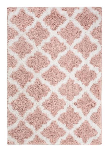 Puderrosa badrumsmatta med marockansk-inspirerat mönster.