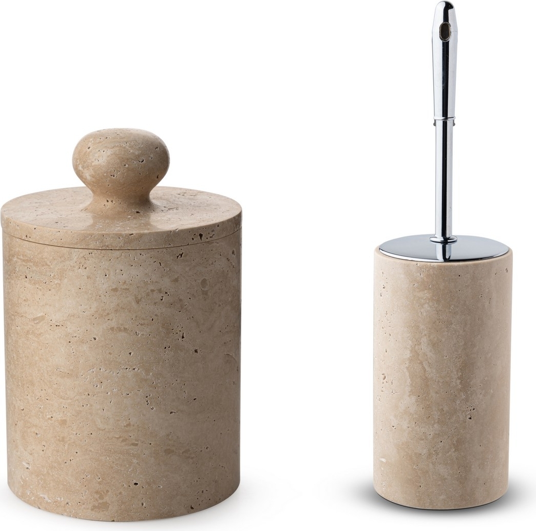 Badrumsset i beige Travertinmarmor med toalettborste och förvaringsburk.