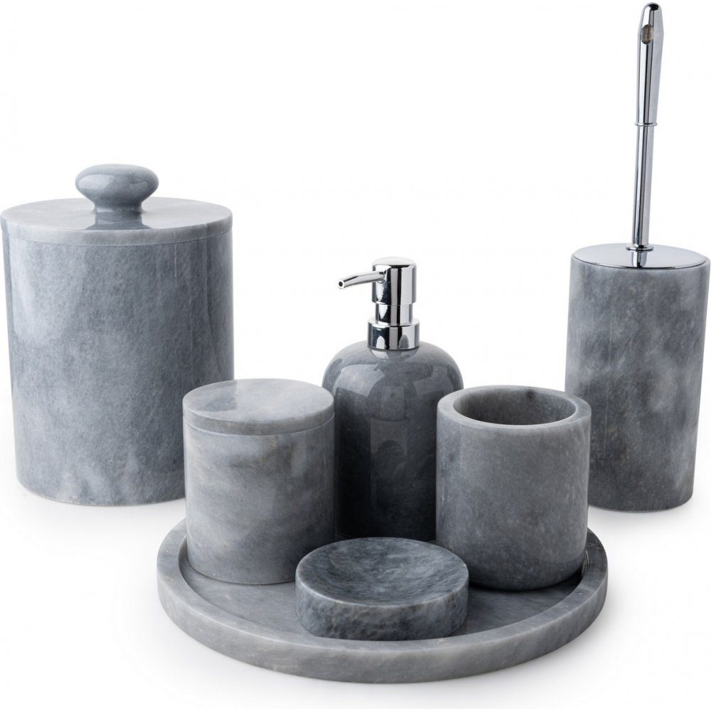 Badrumsset i grå marmor från Verona med bricka, tvålbehållare, tvålkopp, muggar, förvaringsburk och toalettborste.