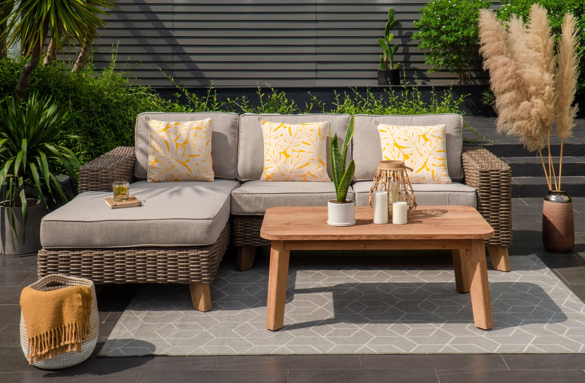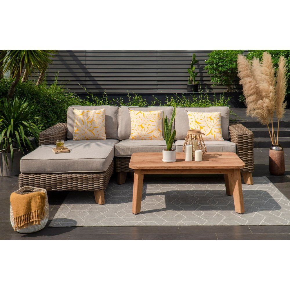 Loungegrupp med 1 st divan, 1 st 2-sits soffa och 1 st soffbord. Divan och soffa har en ram av rostfri aluminium och ben av FSC™märkt teak. Klädd med handvävd konstrotting och dynor av olefin. Soffbordet är tillverkad av återvunnen teak.