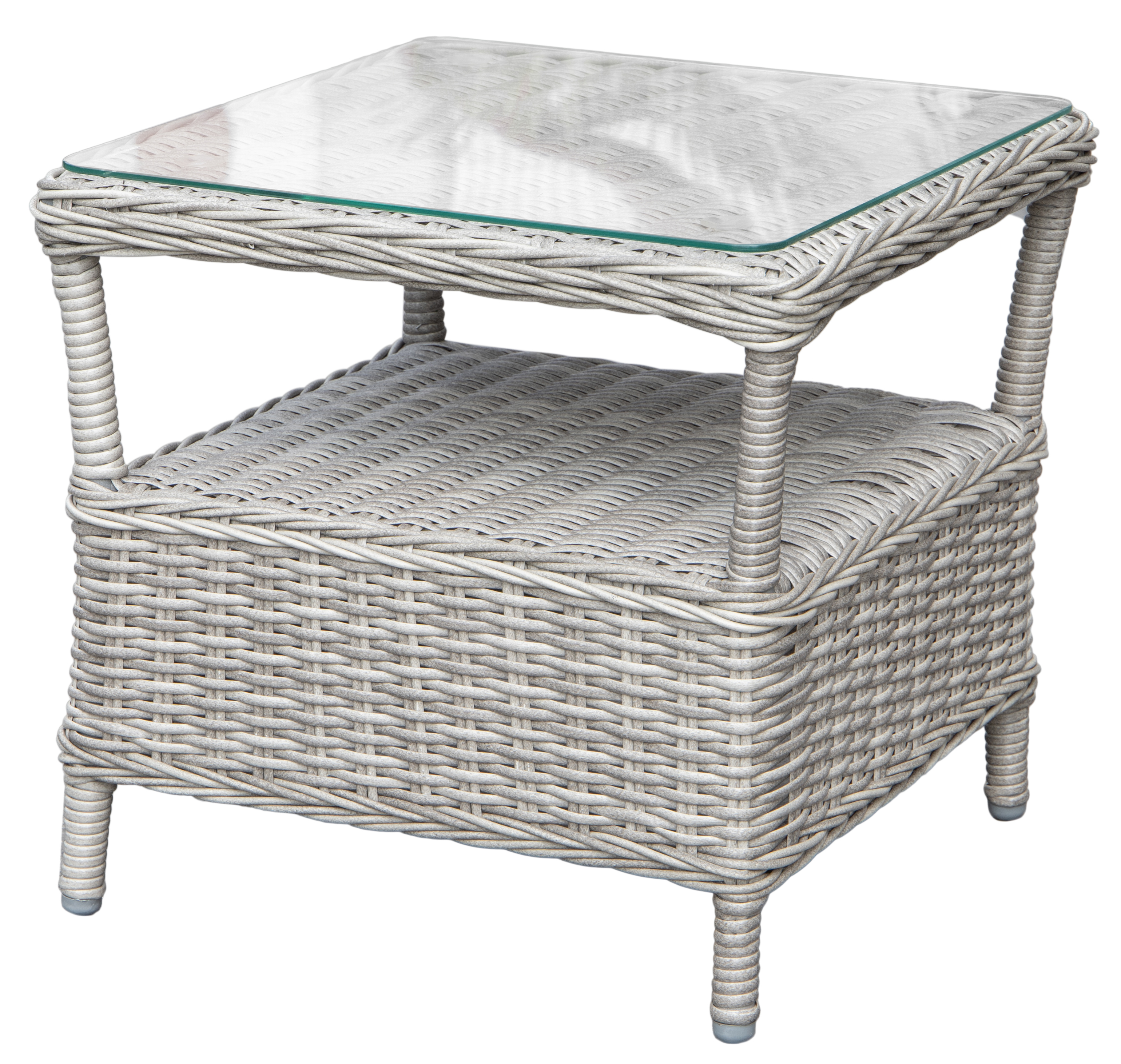 Balkongset består av ett praktiskt sidobord med en toppskiva av tempererat glas i grå konstrotting, tillsammans med bekväma fåtöljer med stomme i aluminium och mörkgrå dynor av polyester för extra sittkomfort. Bordet är från Tor-serien och fåtöljerna från Jacksonville-serien.