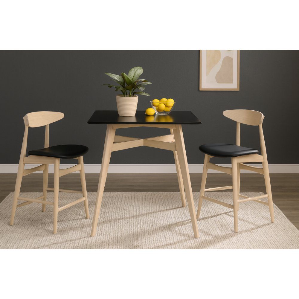 En komplett matgrupp i barhöjd bestående av ett fyrkantigt barbord och två barstolar. Bordet har ett underrede i whitewash och en svart toppskiva. Barstolarna är tillverkade i samma stil med underrede i whitewash och en sits i svart PU. Stolarna har ett svängt ryggstöd för ökad sittkomfort.