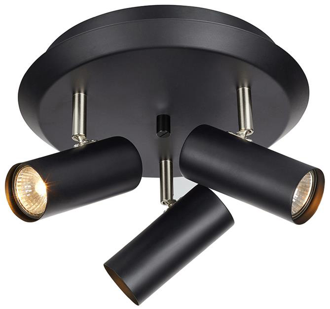 Barcelona stilren taklampa. Ställbara lamphuvud. Monteras på takkrok. Ansluts till jordat uttag. GU10 socklar för max 3x 12W LED.