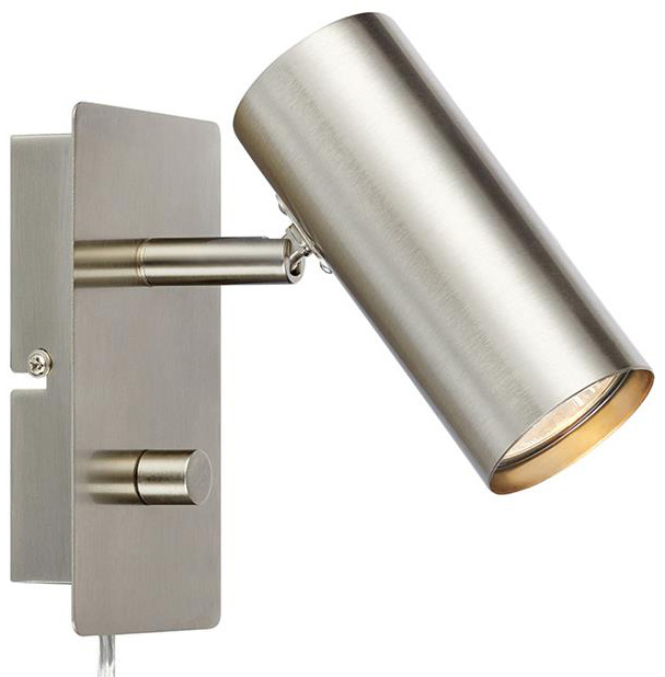 Barcelona stilren vägglampa i metall. Vridbart och ställbart lamphuvud. Inbyggd LED dimmer/strömbrytare på väggplattan. 2 meter transparent sladd. Kopplingsbox i plattan för att enkelt kunna montera på direkt inkommande el.