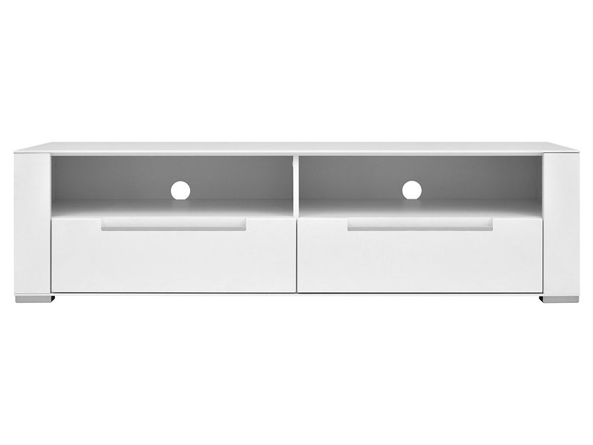 En praktisk mediabänk med två lådor med två öppna fack ovanför. Möbeln har integrerade handtag i aluminium. Baktill har man förborrat hål för dina kablar.