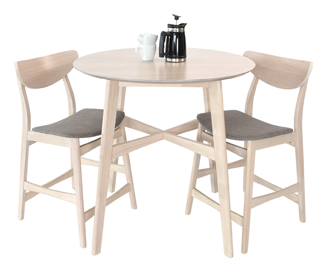 William är en komplett bargrupp bestående av 1 st barbord 90 cm i diameter samt 2 st matchande William barstolar! Möblerna är byggda i MDF/trä i utförande whitewash! Sitsen är stoppad och klädd med ett matchande grått tyg!