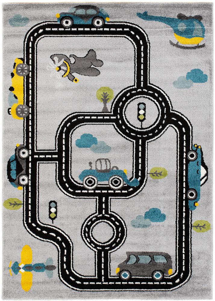 Macie Väg har grå bottenfärg med matchande grå langettering på långsidorna. Mattan pryds utav en vägbana samt flera olika bilar i tonerna gult- grått-turkost. Mattan pryds även utav ett par flygplan samt en helikopter.