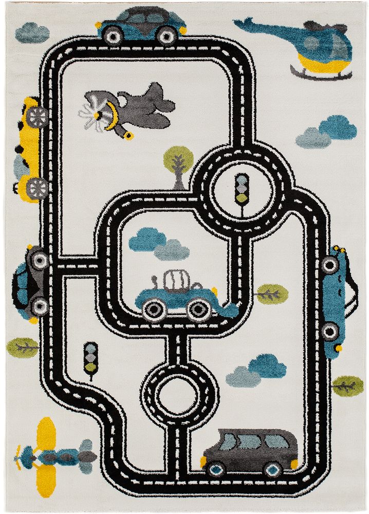 Macie Väg har vit bottenfärg med matchande vit langettering på långsidorna. Mattan pryds utav en vägbana samt flera olika bilar i tonerna gult- grått-turkost. Mattan pryds även utav ett par flygplan samt en helikopter.