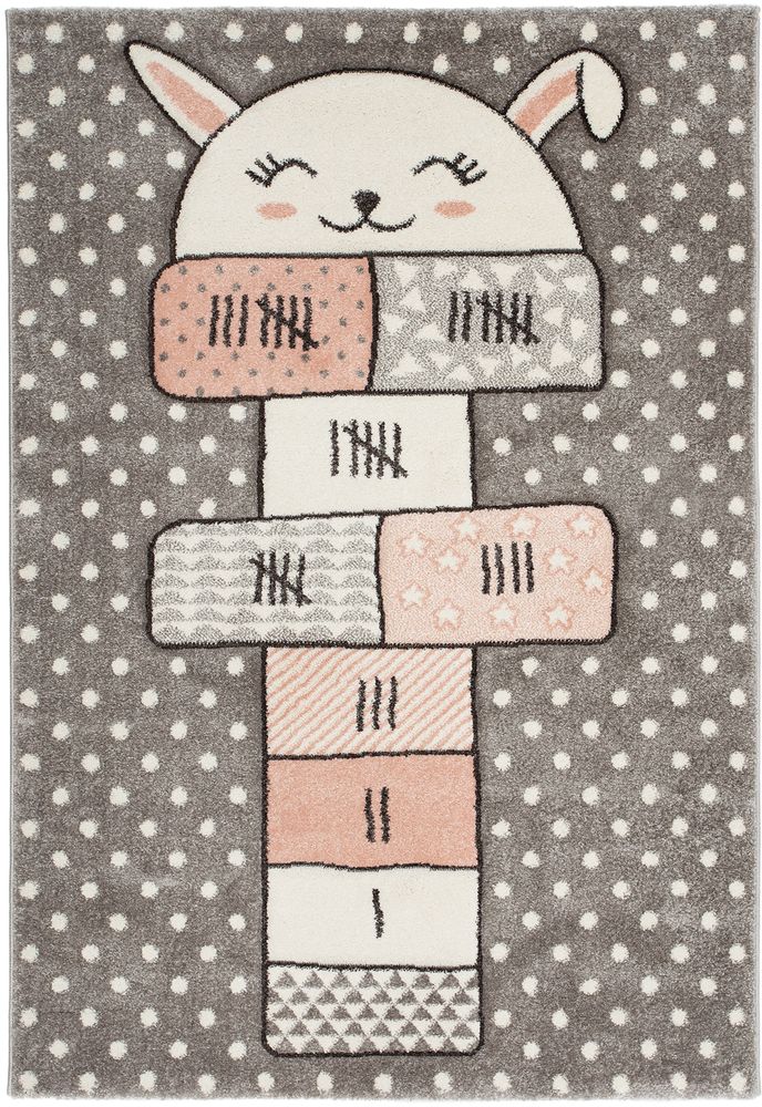 Mitchell Hoppa Hage är en stilren barnmatta som kommer i mjuka pastelltoner. Mattan har en grå botten med vita små prickar och pryds utav en söt kanin vars nos, öron och kinder är puderrosa.
