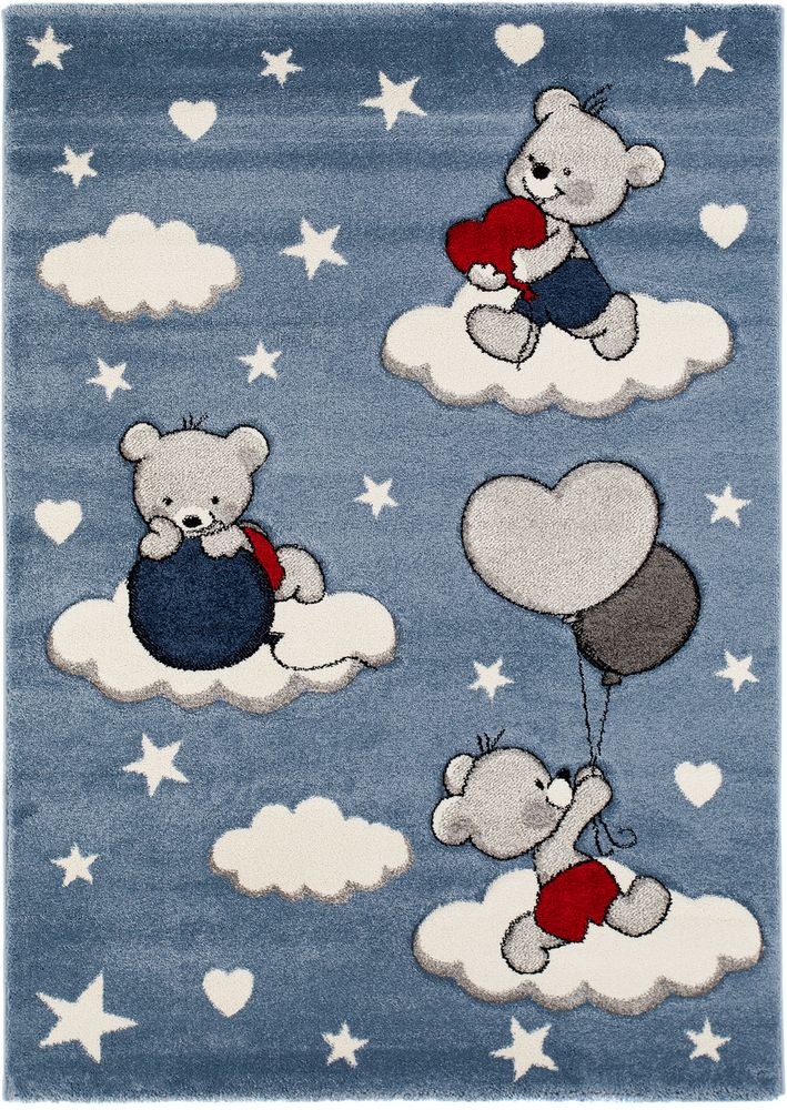Mitchell nalle har blå bottenfärg med matchande blå langettering på långsidorna. Mattan pryds utav 3st gulliga nallar samt vita moln och omges även utav vita stjärnor.