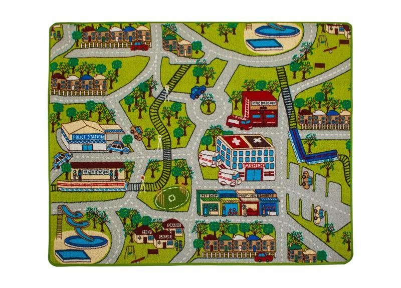 Modesta är en färgglad och lekfull matta vars mönster består av vägar, byggnader och lekplatser. Man får se upp var man kör eftersom vägarna både har rondeller, tågräls och polisbilar att se upp med.