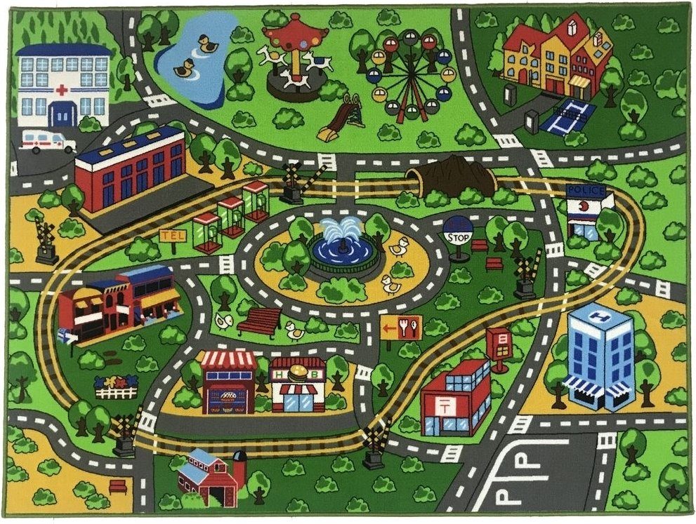 Lekfull vägmatta till barnens lekrum. Tillverkad i polyester med latex på undersidan som halkskydd.