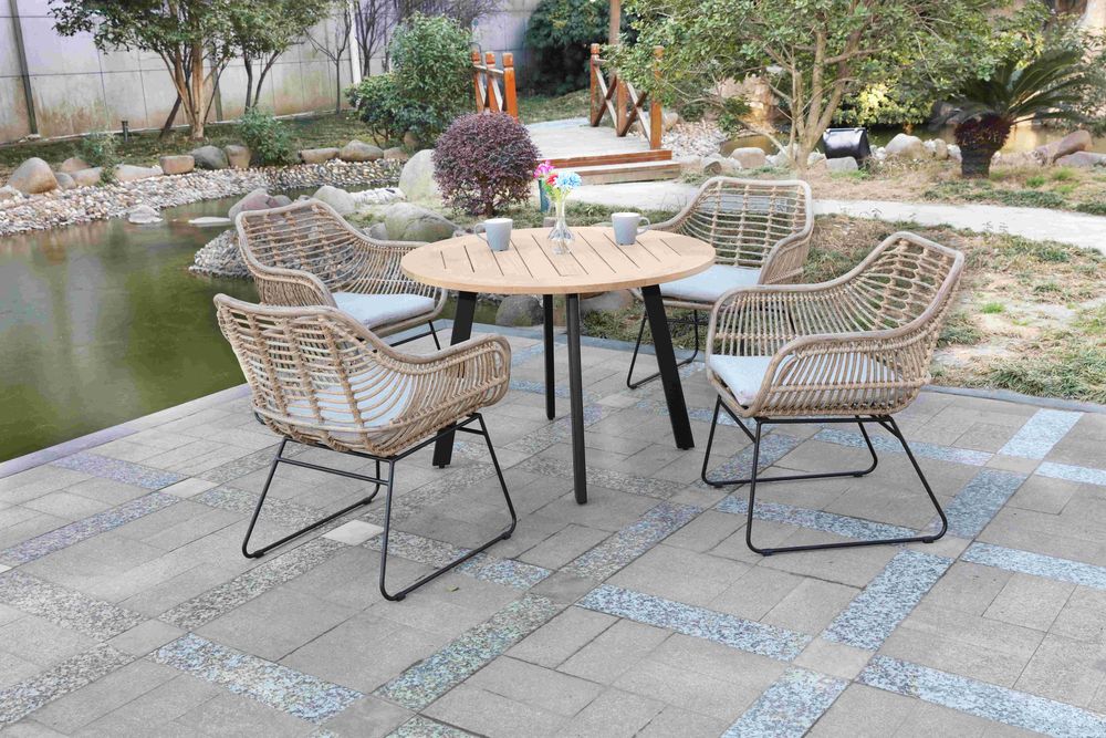 Matgrupp i naturfärgad konstrotting med underrede i svart metall, bordsskivan är gjord i teak. En kombination som gör sig bra ihop.
