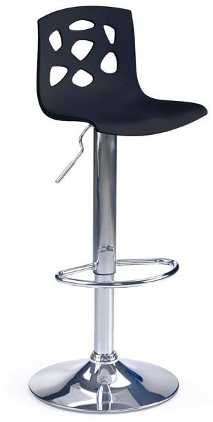 En stilfull barstol med en klassisk design. Underredet är tillverkat i kromad metall med ett praktiskt fortstöd och sitsen är av svart plast. Sitsen är höj- och sänkbar med hjälp av spaken under sitsen.