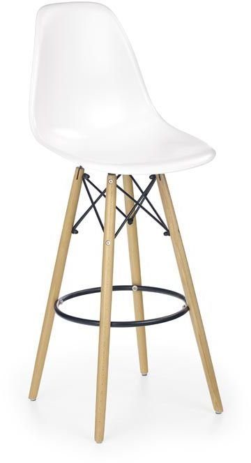 En stilren barstol med en modern design. Underredet är tillverkat av massiv bok med detaljer i svart metall och sitsen är av vit plast.