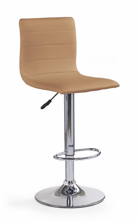 En klassisk barstol med ett stilrent utförande. Underredet är tillverkat i kromad metall med ett praktiskt fotstöd och sitsen är klädd med ett mycket behagligt brunt konstläder. Sitsen är höj- och sänkbar med hjälp av spaken under sitsen.