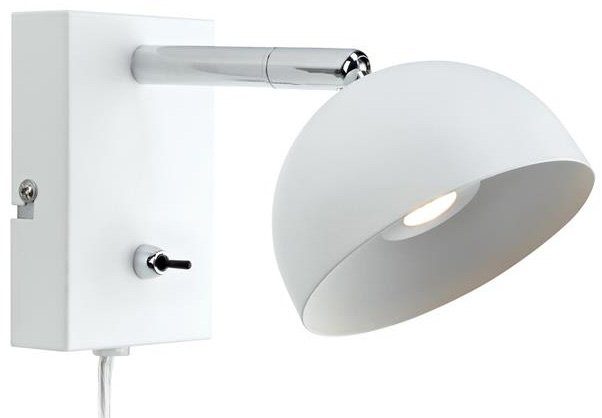 Vägglampa Bas med en härlig design. Tillverkad i vitlackerad metall. 2 meter sladd med U-bygel. Strömbrytare på lampplattan. 2W LED. 3000K. 140 lumen. 38° spridningsvinkel. Energiklass A. Lampan passar perfekt in på flera platser i hushållet.