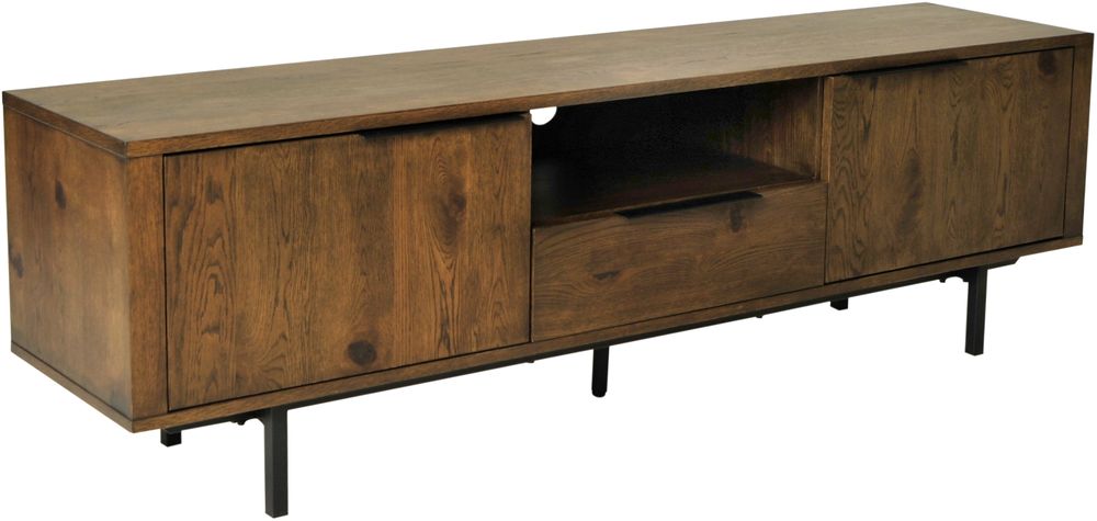 Mediabänk i rustik brunbetsad ekfanér med svart underrede i metall. Bänken är utrustad med 2 dörrar, 1 låda samt 1 st fack för förvaring.