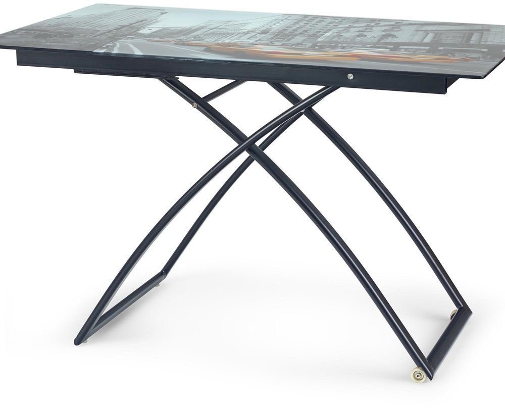 Ett stilrent soffbord med en härlig design. Underredet är tillverkat i svart metall och bordsskivan är av glas med ett snyggt tryck. Bordet är höj- och sänkbart mellan höjderna 38 cm till 75 cm.