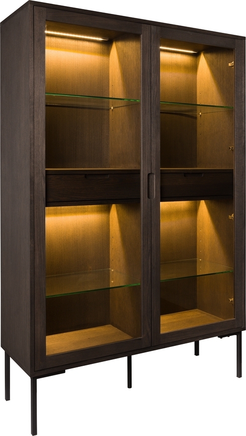 Skåp av oljad ekfaner med glasdörrar och ben av metall. Insidan lyses upp av LED-belysning.
