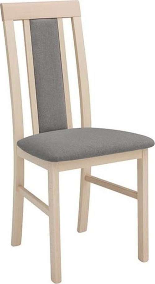 Matstol av trä med klädsel av tyg.