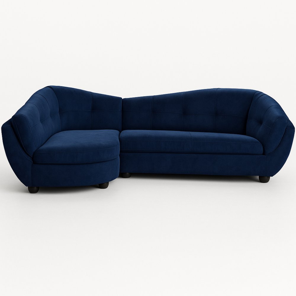 Stommen vilar på svarta, runda ben som ger en stabil och balanserad bas till soffans mjuka former. Klädseln i en djup mörkblå nyans ger möbeln en exklusiv och ombonad känsla som passar både i moderna och mer klassiska miljöer.