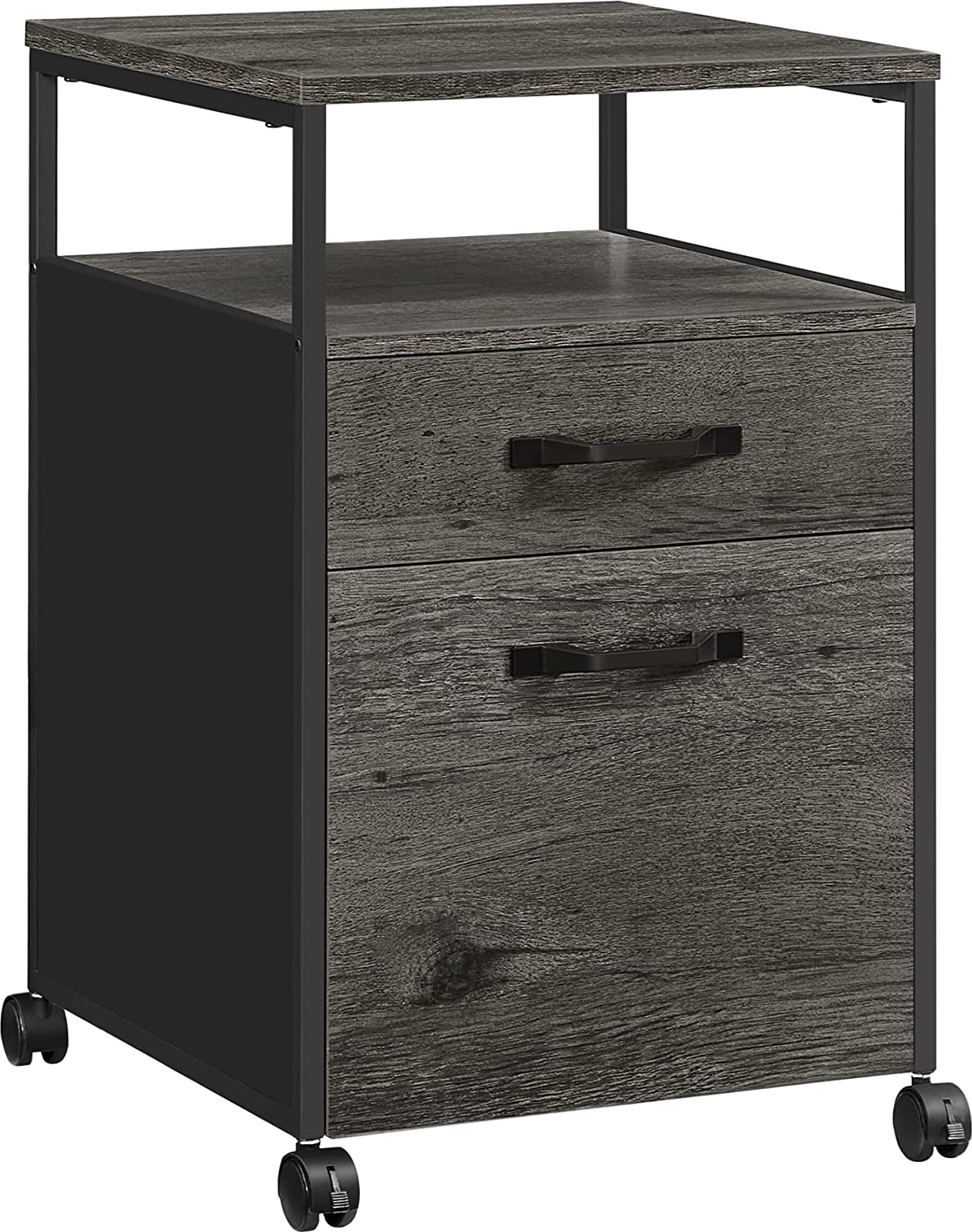 Arkivskåp av stål och trä. 2 av hjulen har broms. Passar för A4-dokument.
