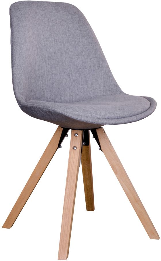Stol i ljusgrått tyg med ben i naturligt trä.