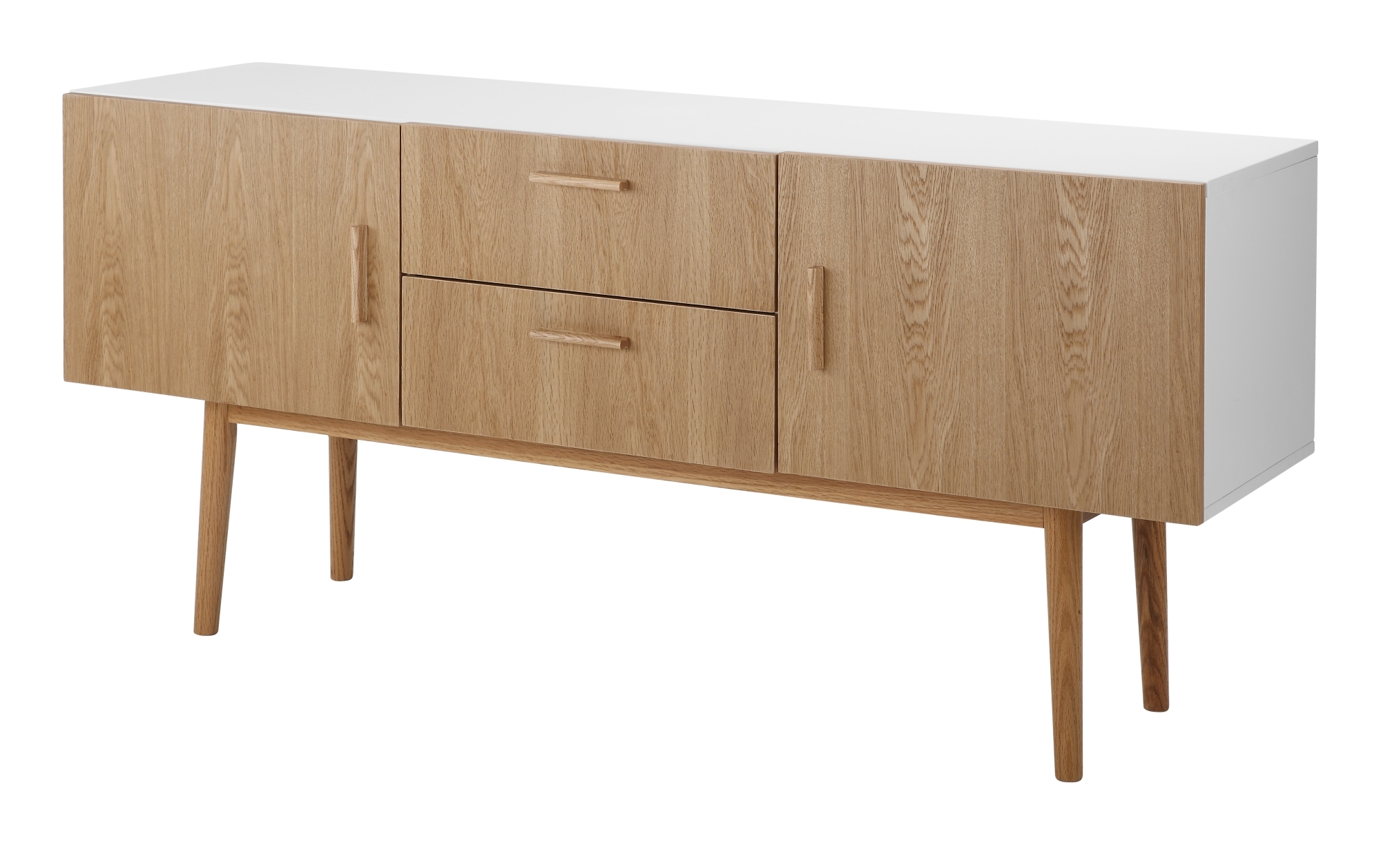Bergen är en helt ny serie av trendiga möbler där mycket fokus har lagts på ett mjukt utseende och bra materialval. De rundade benen är vitoljad ek, dörrar är MDF som är ekfanerade. Vitmålad bas.