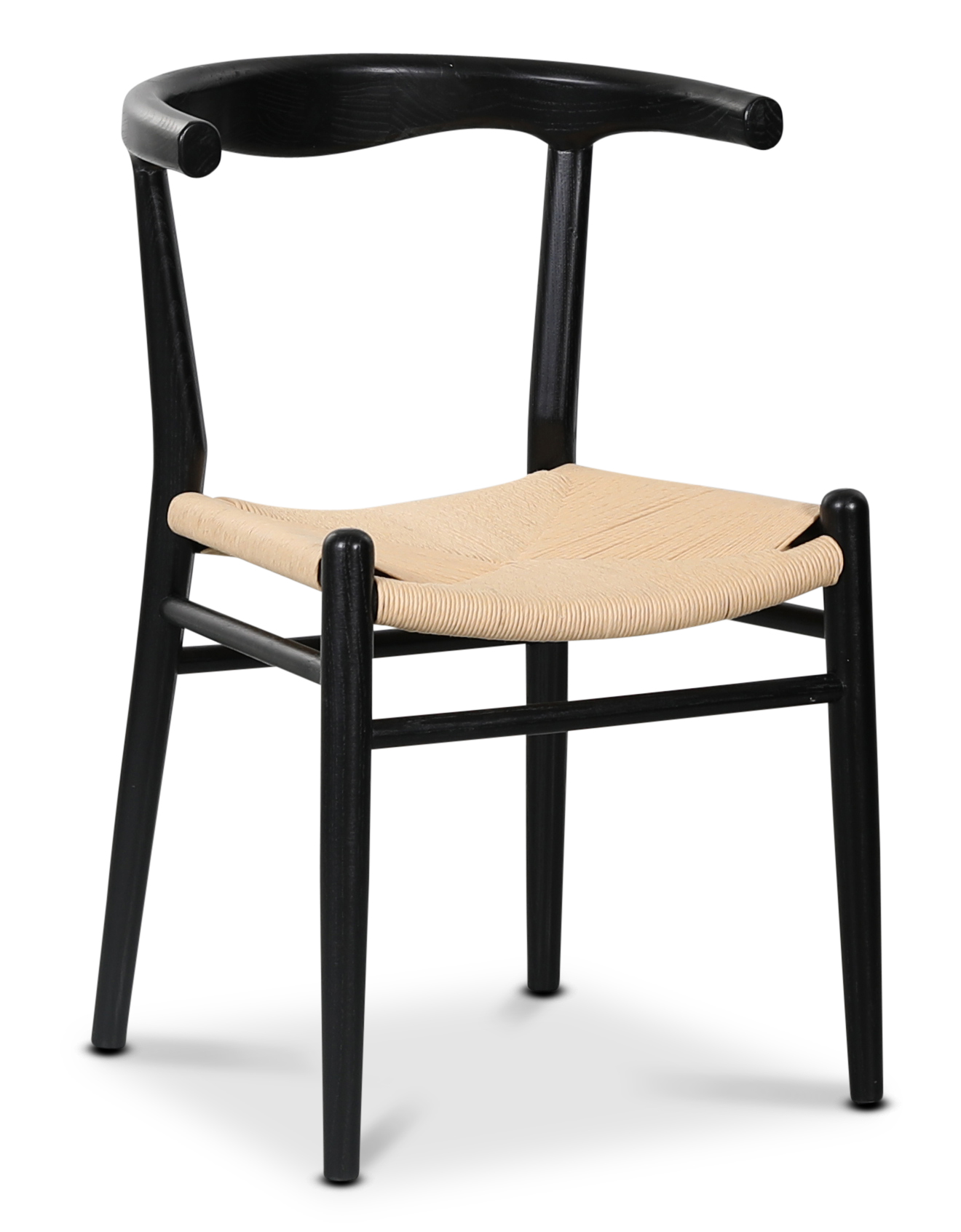 Klassisk matstol i karm-modell i svartmålat massivt almträ med sits av flätat papperssnöre. Levereras monterad.