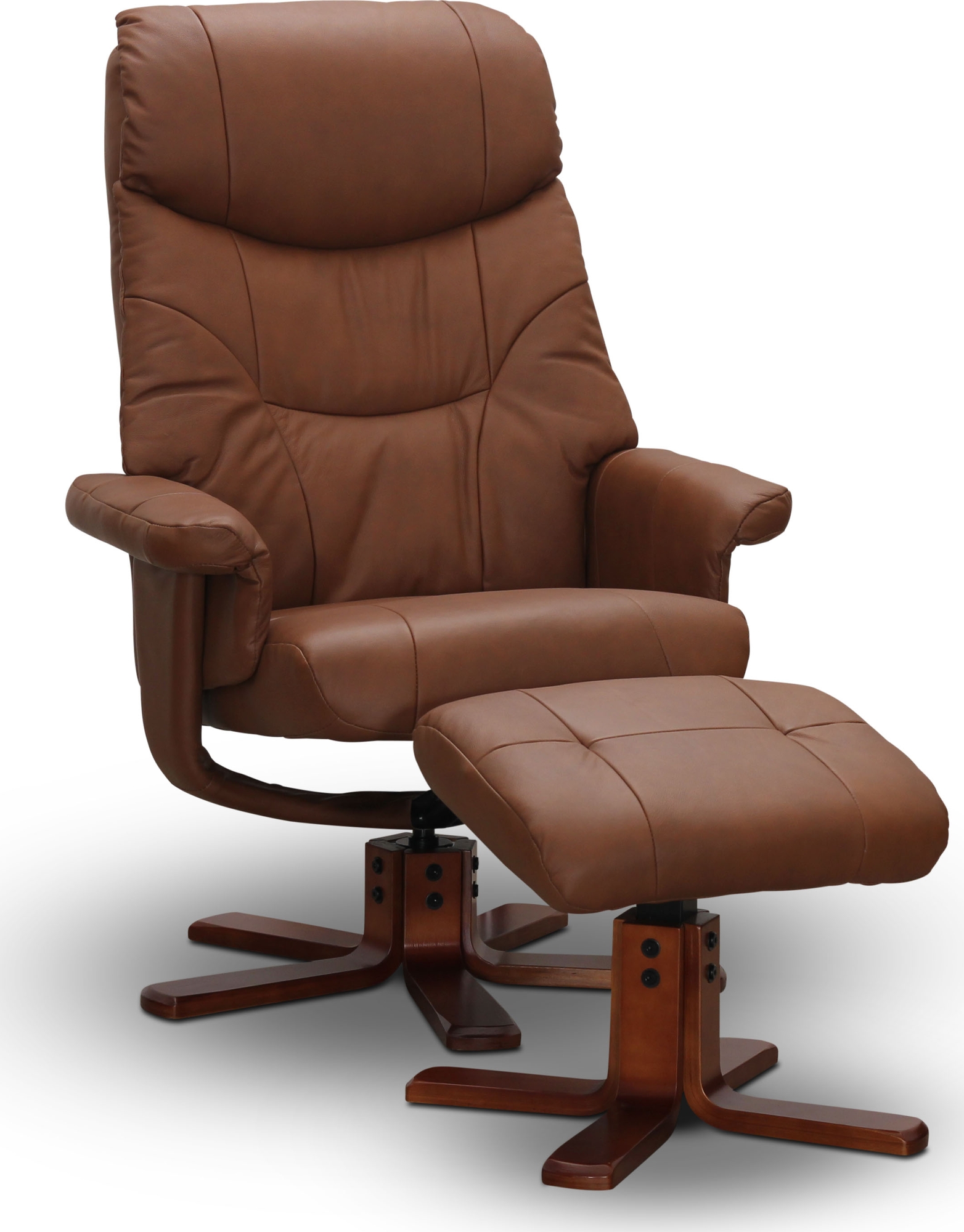 Fåtölj och fotpall med stomme av metall och kryssfötter av brunbetsat trä. Äkta läder på framsidan och konstläder på baksidan. Både stol och pall går att snurra och ryggstödet har steglös lutning.