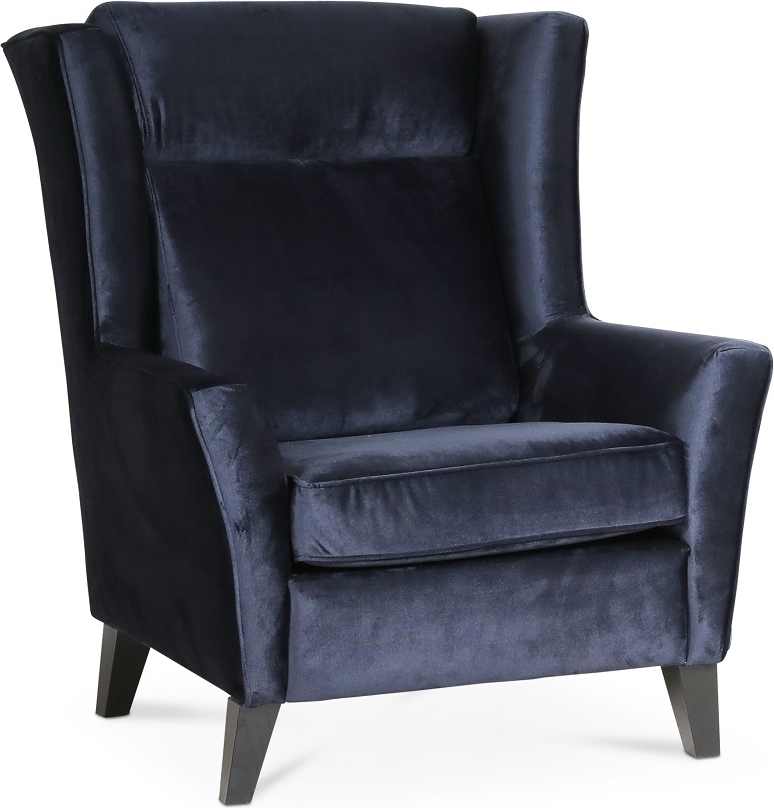 Berta klassisk öronlapsfåtölj i ett mörkblått tyg med sammetsutseende och känsla. Designen är både klassisk och retro. Svarta massiva träben. Skön sittkomfort med påkostad riktig kallskumstoppning för lång hållbarhet.